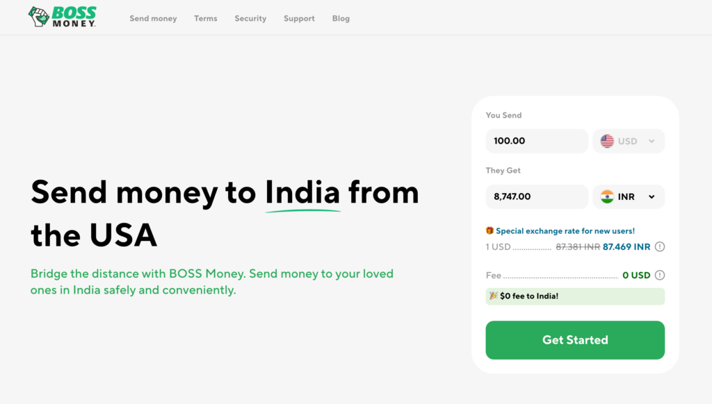 BOSS Money positions itself as low-fee with competitive FX rates. You’ll see both, live, before you pay. Official pages cite fees “as low as $1.99” and frequent special offers (e.g., $0 fee for the first two transfers to any destination or first five to Mexico, subject to promo windows/terms). As with all providers, the final “all-in” cost equals the fee plus (or minus) any FX margin relative to the mid-market rate. Always compare corridors in real time.